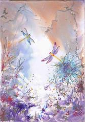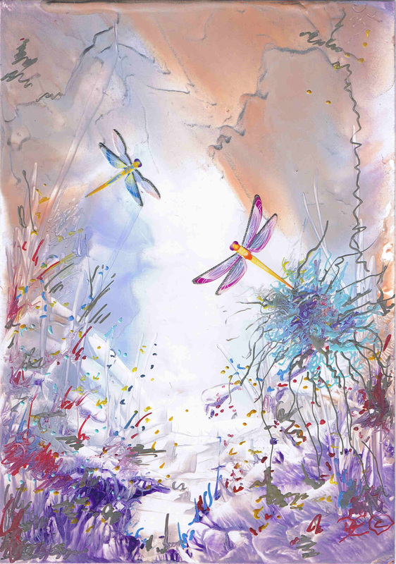 "Je travaille de plusieurs manieres différentes, l'aquarelle avec un mélange de crayons et aussi une technique appelée peinture à la cire encaustique. Cela implique l'utilisation de cire d'abeille pigmentée, qui est fondue et manipulé sur une carte par un fer à basse température. J'étale alors la cire avec un sèche-cheveux jusqu'à ce que je sois satisfaite par la forme de base, ensuite le détail dans le tableau est créé en utilisant un stylet chaud et/ou de grattant la cire sur la carte. Tous ces supports ont un séchage très rapide, ce qui me laisse le temps de poursuivre tous mes autres intérêts créatifs !"