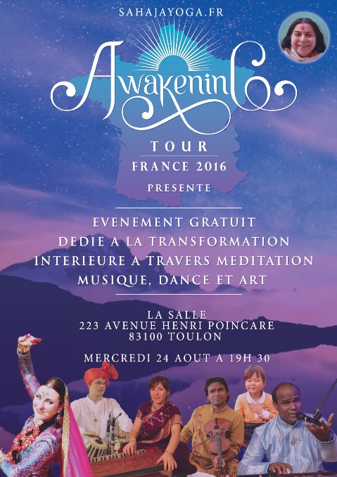 L'association Sahaja Yoga - Méditation Sahaj est heureuse de vous présenter un événement Awakening Tour France 2016, un grand concert de musiques et danses indiennes. A travers ce spectacle entierement gratuit, expérimentez le pouvoir de transformation intérieure de la musique et de la danse indienne sur votre propre etre.